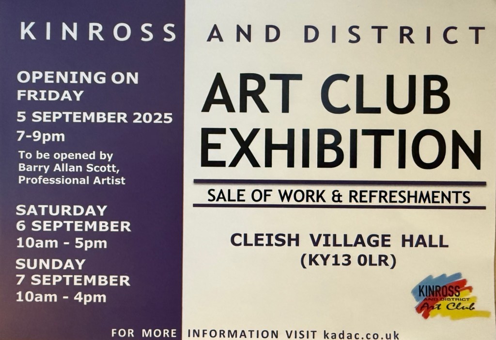 Categories Uncategorized Art Club Exhibition Post author By chaircabcc9228 Post date September 5, 2025 No Comments on Art Club Exhibition Kinross Art Club has an exciting exhibition on this weekend. Share this: Click to share on X (Opens in new window) X Click to share on Facebook (Opens in new window) Facebook Like Loading... Related ← COMMUNITY COUNCIL ELECTIONS 2025 → 2025-08-04 CC Meeting Minutes Leave a comment Cancel reply Δ